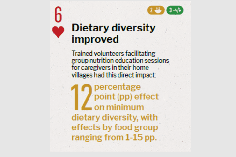 Strategy researched Trained volunteers facilitating nutrition education sessions in their home villages among group of caregivers with children 5-18 months of age Impact achieved Country of study Malawi Research methodology Cluster RCT with 1,791 households Journal Journal paper title and link Excerpt from Abstract "A positive impact on child dietary diversity was observed (B (SE) = 0.39 (0.15), p = 0.01; 95%CI 0.09–0.68). There was a non-significant positive intervention effect on mean height-for-age z-scores (B (SE) = 0.17 (0.12), p = 0.15; 95%CI -0.06–0.41). |