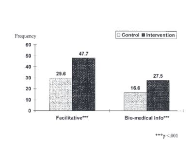 Following the intervention, doctors in the intervention group provided 63% more biomedical information and counseling than those in the control group (27.5 versus 16.6, P < 0.001), and this difference remained significant even after controlling for other factors (ß = 0.26, P < 0.001). The panel study confirms this finding: Information-giving increased from 7.8 to 25.1 (P < 0.001) in the intervention group, compared with a rise from 7.7 to 16.6 (P < 0.001) in the control group. After controlling for other factors, these increases remained significant both in the intervention (ß = 0.44, P < 0.001) and control groups (ß = 0.42, P < 0.05). However, the rate of change was significantly greater in the intervention than control group (P = 0.0001).