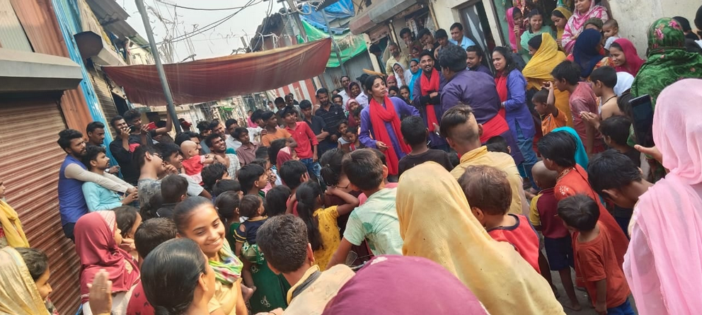 In 40 clusters, each containing around 600 households, 20 were randomly allocated to have a resource centre (intervention group) and 20 no centre (control group). A SNEHA centre was set up in each intervention cluster in rented premises. Each centre employed three full-time, salaried community organisers who were educated to at least the ninth grade and had similar socioeconomic backgrounds to potential beneficiaries. After 1 month of training (including in communication and negotiation skills), followed by regular supervision and follow-up visits by SNEHA staff and invited experts, the organisers were responsible for organising home visits, group meetings, day care for malnourished children, service provision (e.g., counseling and support for survivors of intimate partner violence), and liaision with existing systems. They also held community events, such as puppet shows, street plays, rallies, games, competitions, "flash mobs", cooking demonstrations, the Godbharai baby shower, Ushtavan initiation of complementary feeding, and celebrations of improvements in child health and nutrition that provided opportunities to discuss health behaviours and sought to create an enabling environment.