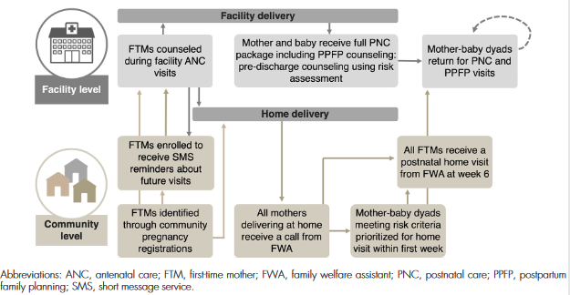 - Ultimately, the core design team selected 3 of the approaches (strengthening immediate PPFP, strengthening predischarge counselling, and supporting postnatal home visits, or HVs) to be combined into a final approach, which aims to increase uptake of PPFP through strengthening the quality and responsiveness of facility-based antenatal and postnatal counseling and care (including predischarge counselling and care) to FTMs. At the community level, family welfare assistants (FWAs) are supported to provide targeted postnatal HVs, during which they distribute a mother-baby booklet written for girls and young women becoming FTMs and their male partners, as well as a printed invitation card that invites FTMs to access RMNCH services, including PPFP, from the closest health facility.