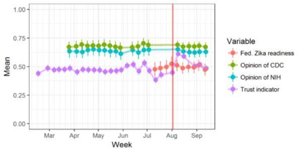 Following widespread media coverage of the trial, people paid more attention to news about the Zika virus and showed greater trust in science. The spike in public confidence in science lasted just 2 weeks, though the heightened attention to the Zika virus persisted for 6 weeks. Opinions toward the CDC or the NIH did not improve, despite the considerable increase in media representation by the directors of those agencies, nor did respondents report feeling that the federal government was more prepared to manage a Zika outbreak.