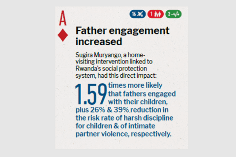 Strategy researched Sugira Muryango (SM - a home-visiting intervention linked to Rwanda's social protection system) and integrated promotion of father engagement and family violence prevention Impact achieved Country of study Rwanda Research methodology Cluster RCT with 1,049 families Journal Journal paper title and link Excerpt from Abstract "Children in SM families improved more on gross motor (d=0.162, 95% CI 0.065 to 0.260), communication (d=0.081, 95% CI 0.005 to 0.156), problem solving (d=0.101, 95% CI 0.002 to 0.179) and personal-social development (d=0.096, 95% CI −0.015 to 0.177) on the ASQ-3 [Ages and Stages Questionnaire - 3]. SM families showed increased father engagement (OR=1.592, 95% CI 1.069 to 2.368), decreased harsh discipline (incidence rate ratio, IRR=0.741, 95% CI 0.657 to 0.835) and intimate partner violence (IRR=0.616, 95% CI:0.458 to 0.828)." |