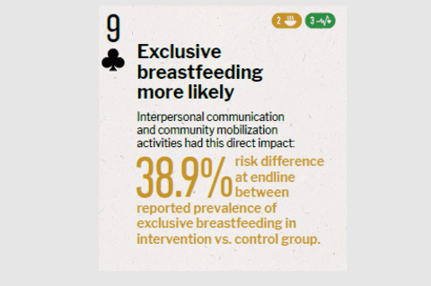 Strategy researched Interpersonal communication and community mobilization activities Impact achieved Country of study Burkina Faso Research methodology RCT Journal Journal paper title and link Excerpt from Abstract "At endline, there was a risk difference of 38·9% (95% CI 32·2–45·6, p<0·001) between the reported prevalence of exclusive breastfeeding in the intervention group and that of the control group." |