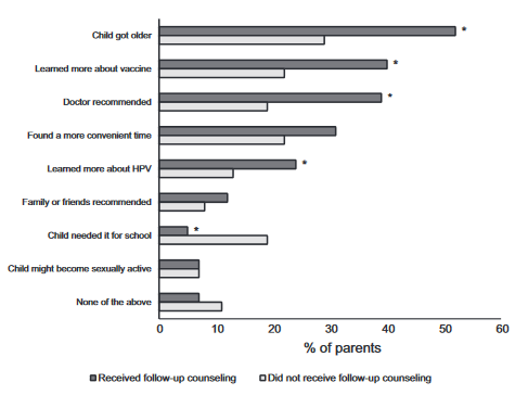 The importance of follow-up counseling, which is provided by only half of providers, highlights missed opportunities for providers to deliver additional HPV vaccine recommendations and education. (The findings also speak to the need for improving provider communication about HPV vaccination, because approximately one-third of parents in the sample reported lower levels of satisfaction with their provider's communication, and approximately one-fifth did not recall receiving a recommendation.) The parents in this study who received follow-up counseling were more likely to report as their reason for secondary acceptance that they learned more about the vaccine, and that they received a provider recommendation, than parents who did not receive such counseling. Follow-up counseling might also be important for meeting parents' communication preferences; previous research published by these researchers suggests that many parents who refuse or delay HPV vaccination prefer to decide about the vaccine at a later visit rather than the same day. "Although providers should continue to prioritize the goal of preventing declination, follow-up counseling is likely to play an important role in parental acceptance of HPV vaccination when declination does occur."