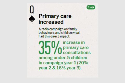 Strategy researched A radio campaign addressing family behaviours on all-cause post-neonatal under-5 child mortality Impact achieved Country of study Burkina Faso Research methodology Repeated cross-sectional cluster RCT Journal The Lancet Global Health; 2018 Journal paper title and link Excerpt from Abstract "Post-neonatal under-5 child mortality decreased from 93·3 to 58·5 per 1000 livebirths in the control group and from 125·1 to 85·1 per 1000 livebirths in the intervention group. There was no evidence of an intervention effect (risk ratio 1·00, 95% CI 0·82–1·22; p>0·999). In the first year of the intervention, under-5 consultations increased from 68 681 to 83 022 in the control group and from 79 852 to 111 758 in the intervention group. The intervention effect using interrupted time-series analysis was 35% (95% CI 20–51; p<0·0001). New antenatal care attendances decreased from 13 129 to 12 997 in the control group and increased from 19 658 to 20 202 in the intervention group in the first year (intervention effect 6%, 95% CI 2–10; p=0·004). Deliveries in health facilities decreased from 10 598 to 10 533 in the control group and increased from 12 155 to 12 902 in the intervention group in the first year (intervention effect 7%, 95% CI 2–11; p=0·004)." |