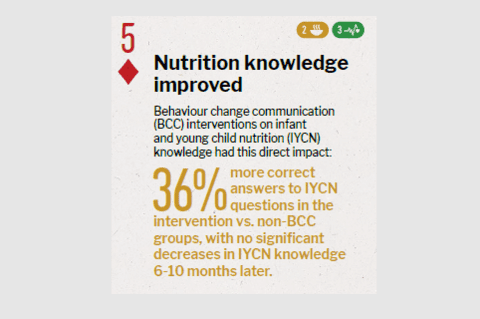 Strategy researched Nutrition-sensitive social protection interventions on infant and young child nutrition (IYCN) knowledge in rural Bangladesh, both during and after behaviour change communication (BCC) intervention activities Impact achieved Country of study Bangladesh Research methodology RCT Journal Journal paper title and link Excerpt from Abstract "There are 3 main findings: First, the BCC improves IYCN knowledge substantially in the 1st year of the intervention; participants correctly answer 3.0–3.2 more questions (36% more) compared to the non-BCC groups. Second, the increase in knowledge between the 1st and 2nd year was smaller, an additional 0.7–0.9 correct answers. Third, knowledge persists; there are no significant decreases in IYCN knowledge 6–10 months after nutrition BCC activities ended." |