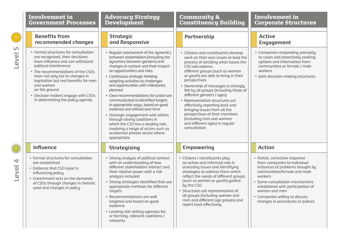 Focusing on 4 key areas of advocacy capacity - Involvement in Government Processes, Advocacy Strategy Development, Community & Constituency Building, and Involvement in Corporate Structures - the tool allows the user to assess the readiness to conduct advocacy based on a 5-level scale. For example, one indicator in Level 4 of Community & Constituency Building is: "Citizens / constituents play an active and informed role in assessing issues and identifying strategies to address them which reflect the needs of different groups (such as women or youth), guided by the CSO [civil society organisation]." The levels are cumulative, and require partner organisations (e.g., CSOs CAFOD works with) to think through the reasons why they might be classed at one level or another by providing anecdotal evidence in each case. The tool does not prescribe which elements to emphasise in any given level.